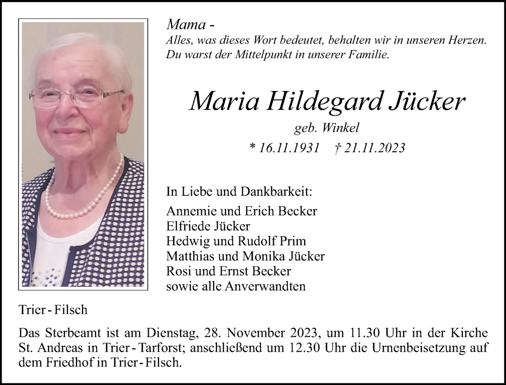 Hier finden Sie alle Traueranzeigen aus der Zeitung, die bisher für Maria Hildegard Jücker erschienen sind. Weitere Traueranzeigen, die in der Zeitung erscheinen, werden hier ebenfalls aufgelistet