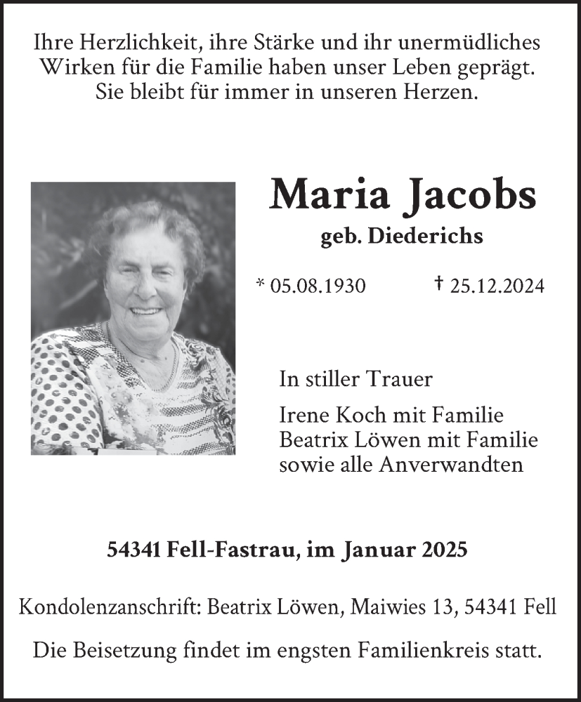 Hier finden Sie alle Traueranzeigen aus der Zeitung, die bisher für Maria Jacobs erschienen sind. Weitere Traueranzeigen, die in der Zeitung erscheinen, werden hier ebenfalls aufgelistet