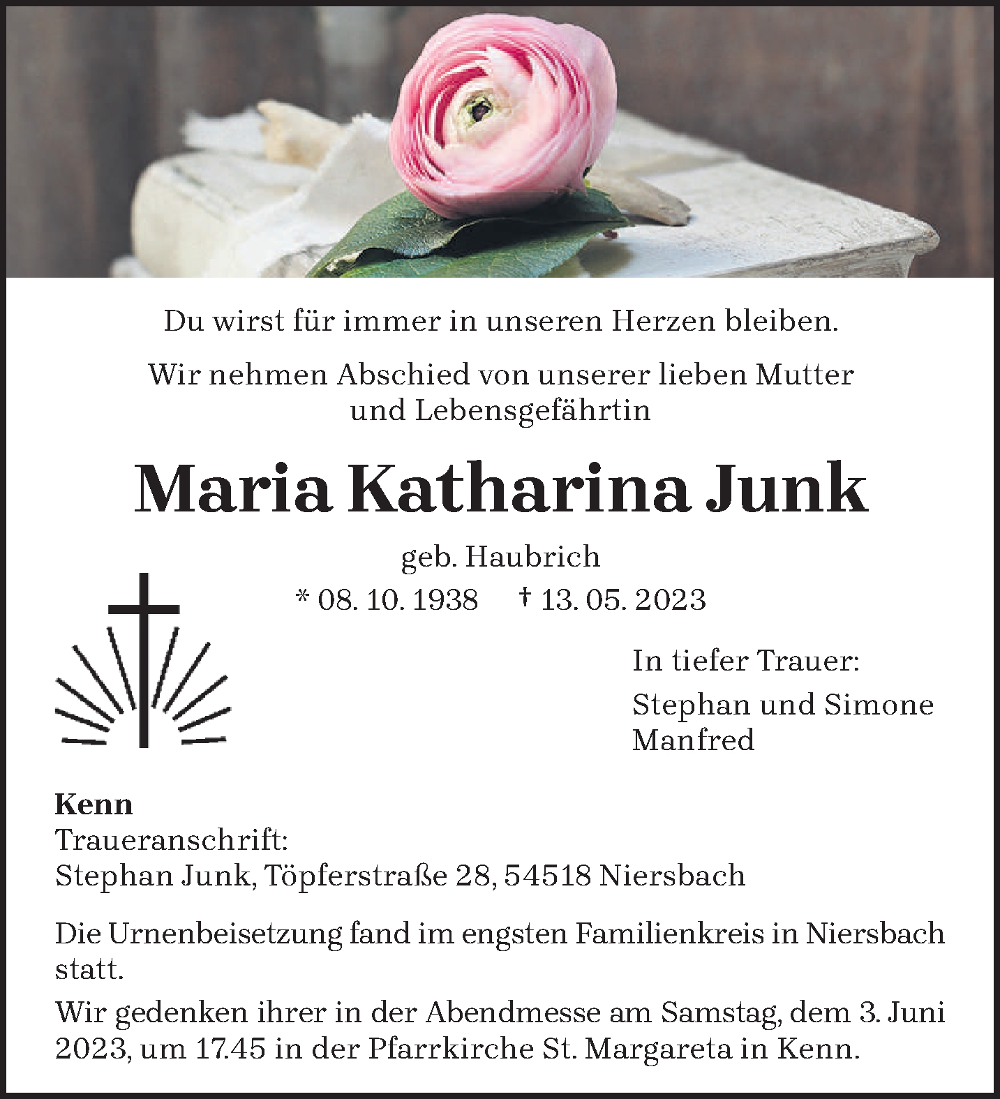Hier finden Sie alle Traueranzeigen aus der Zeitung, die bisher für Maria Katharina Junk erschienen sind. Weitere Traueranzeigen, die in der Zeitung erscheinen, werden hier ebenfalls aufgelistet