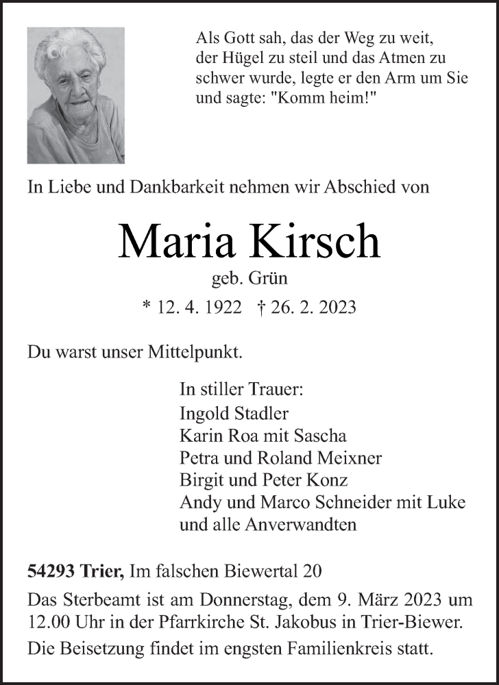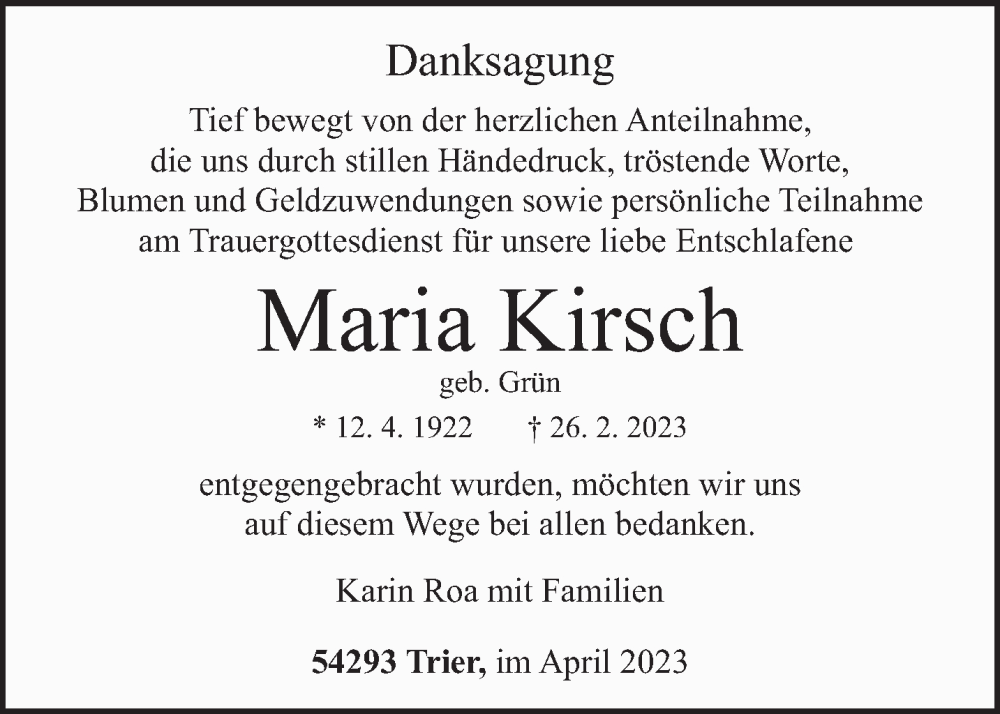 Hier finden Sie alle Traueranzeigen aus der Zeitung, die bisher für Maria Kirsch erschienen sind. Weitere Traueranzeigen, die in der Zeitung erscheinen, werden hier ebenfalls aufgelistet