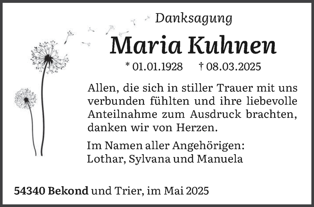 Hier finden Sie alle Traueranzeigen aus der Zeitung, die bisher für Maria Kuhnen erschienen sind. Weitere Traueranzeigen, die in der Zeitung erscheinen, werden hier ebenfalls aufgelistet
