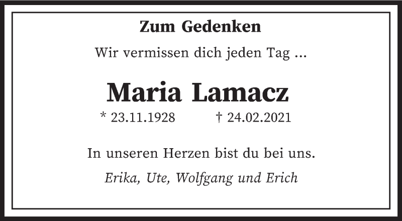 Hier finden Sie alle Traueranzeigen aus der Zeitung, die bisher für Maria Lamacz erschienen sind. Weitere Traueranzeigen, die in der Zeitung erscheinen, werden hier ebenfalls aufgelistet