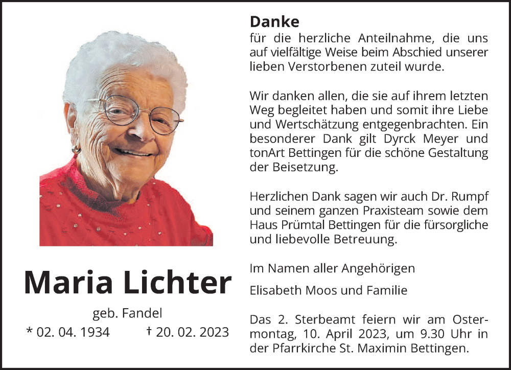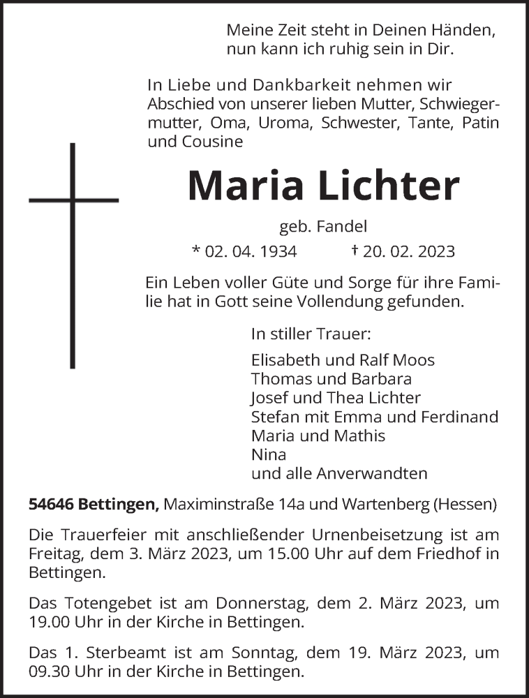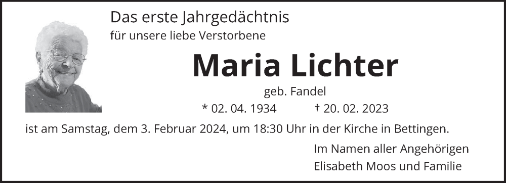 Hier finden Sie alle Traueranzeigen aus der Zeitung, die bisher für Maria Lichter erschienen sind. Weitere Traueranzeigen, die in der Zeitung erscheinen, werden hier ebenfalls aufgelistet