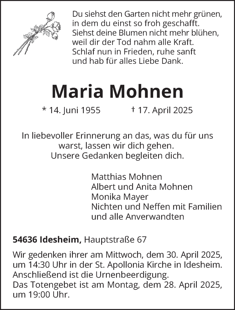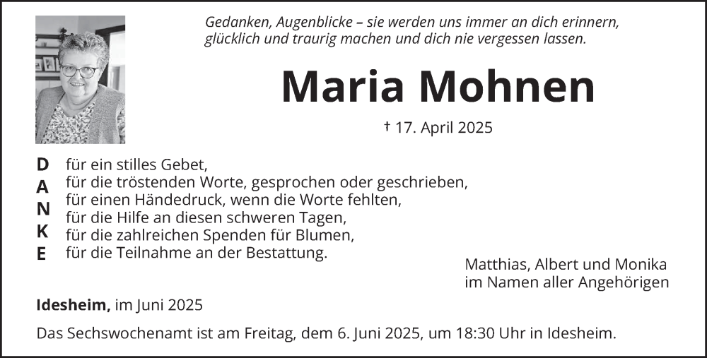 Hier finden Sie alle Traueranzeigen aus der Zeitung, die bisher für Maria Mohnen erschienen sind. Weitere Traueranzeigen, die in der Zeitung erscheinen, werden hier ebenfalls aufgelistet