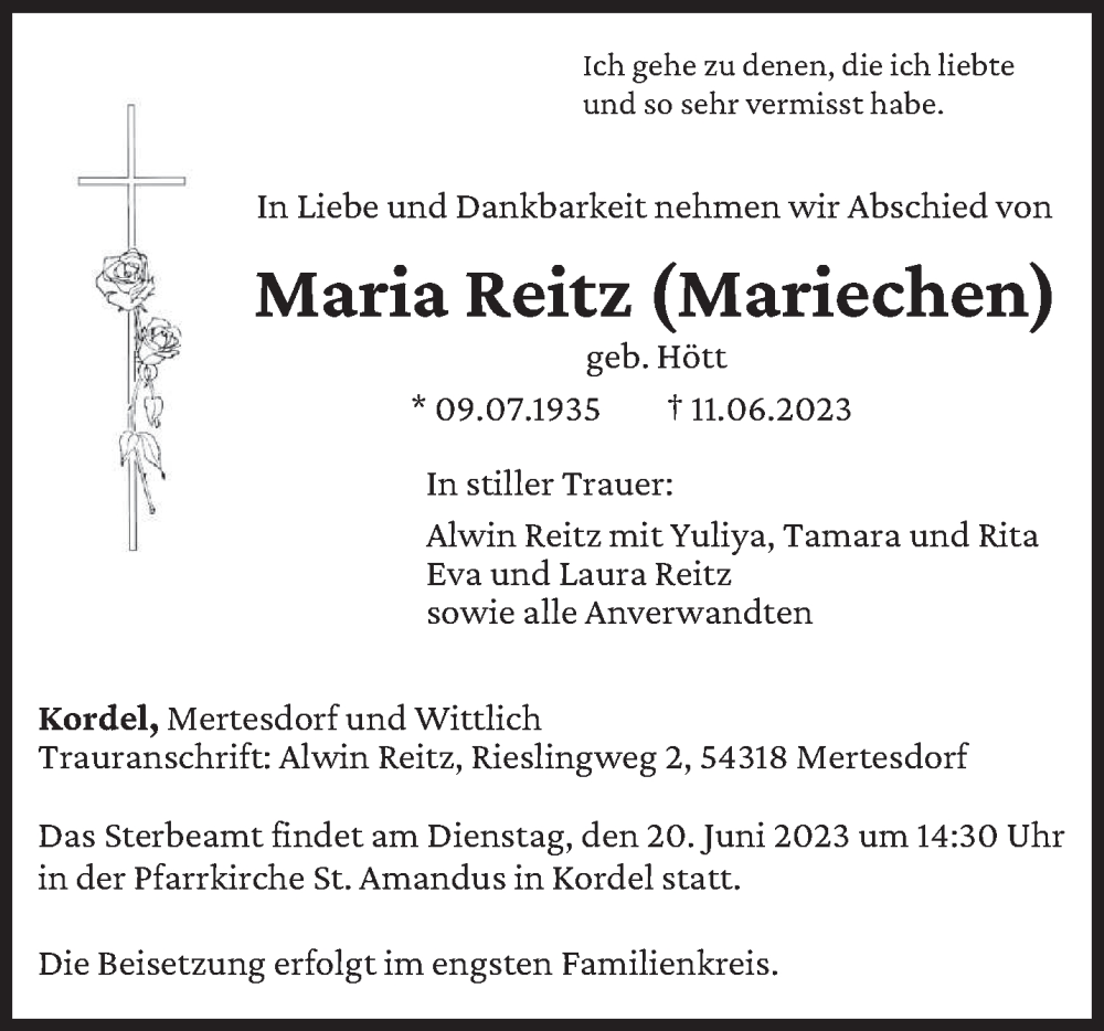 Hier finden Sie alle Traueranzeigen aus der Zeitung, die bisher für Maria Reitz erschienen sind. Weitere Traueranzeigen, die in der Zeitung erscheinen, werden hier ebenfalls aufgelistet