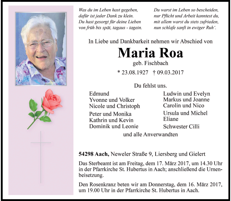 Hier finden Sie alle Traueranzeigen aus der Zeitung, die bisher für Maria Roa erschienen sind. Weitere Traueranzeigen, die in der Zeitung erscheinen, werden hier ebenfalls aufgelistet