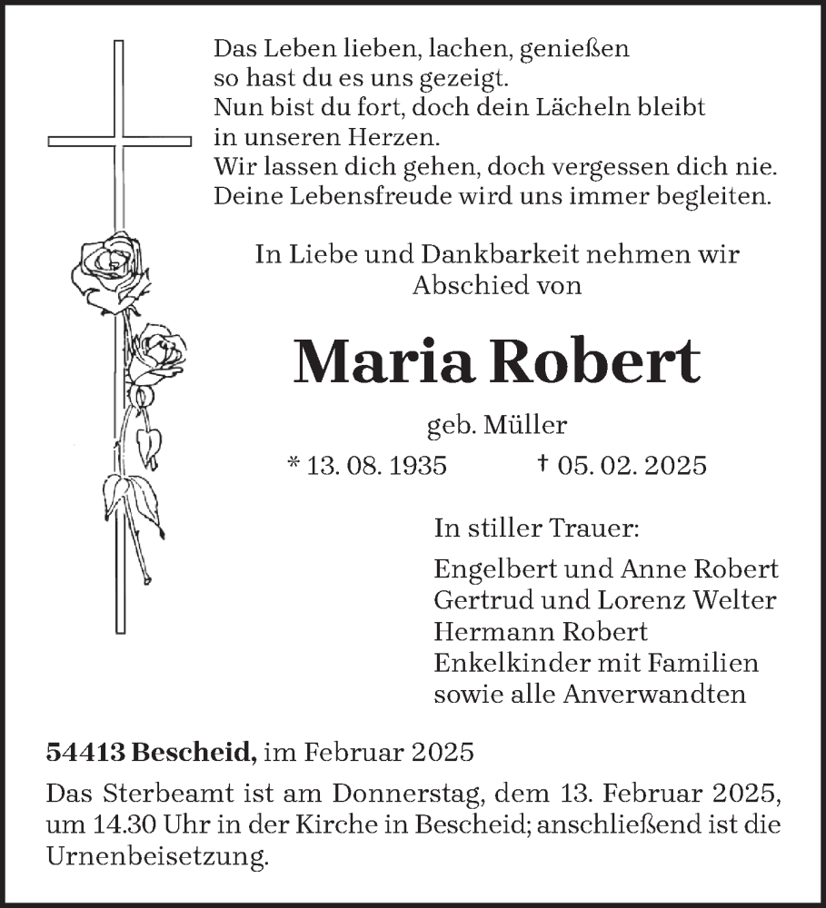 Hier finden Sie alle Traueranzeigen aus der Zeitung, die bisher für Maria Robert erschienen sind. Weitere Traueranzeigen, die in der Zeitung erscheinen, werden hier ebenfalls aufgelistet