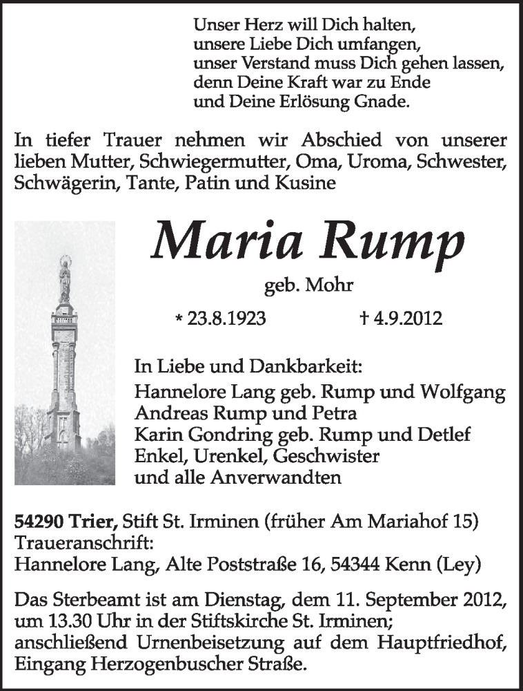 Hier finden Sie alle Traueranzeigen aus der Zeitung, die bisher für Maria Rump erschienen sind. Weitere Traueranzeigen, die in der Zeitung erscheinen, werden hier ebenfalls aufgelistet