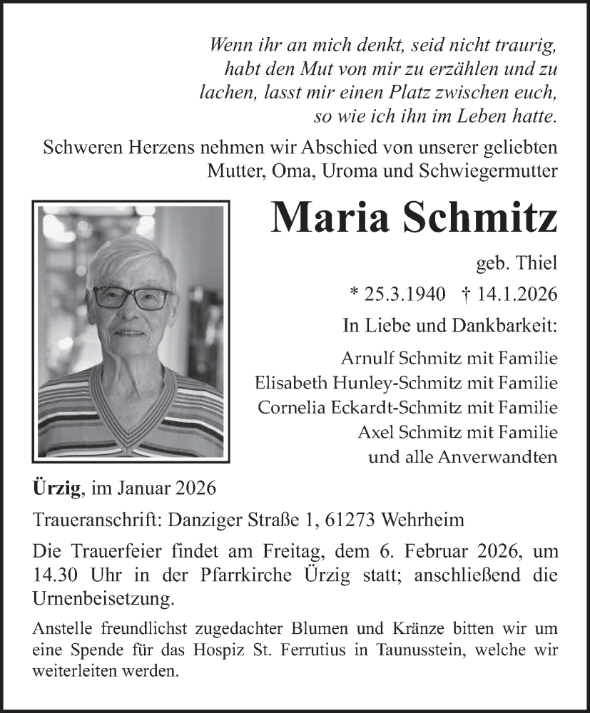 Hier finden Sie alle Traueranzeigen aus der Zeitung, die bisher für Maria Schmitz erschienen sind. Weitere Traueranzeigen, die in der Zeitung erscheinen, werden hier ebenfalls aufgelistet