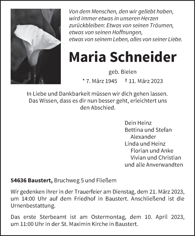 Hier finden Sie alle Traueranzeigen aus der Zeitung, die bisher für Maria Schneider erschienen sind. Weitere Traueranzeigen, die in der Zeitung erscheinen, werden hier ebenfalls aufgelistet