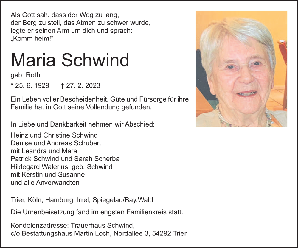 Hier finden Sie alle Traueranzeigen aus der Zeitung, die bisher für Maria Schwind erschienen sind. Weitere Traueranzeigen, die in der Zeitung erscheinen, werden hier ebenfalls aufgelistet