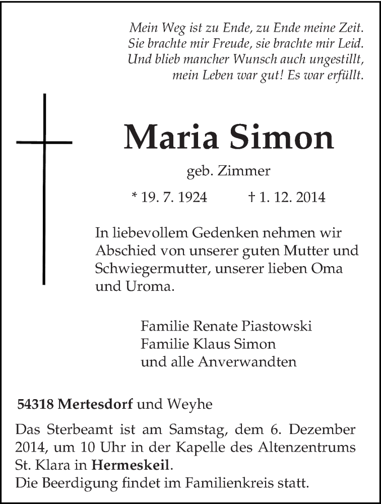 Hier finden Sie alle Traueranzeigen aus der Zeitung, die bisher für Maria Simon erschienen sind. Weitere Traueranzeigen, die in der Zeitung erscheinen, werden hier ebenfalls aufgelistet