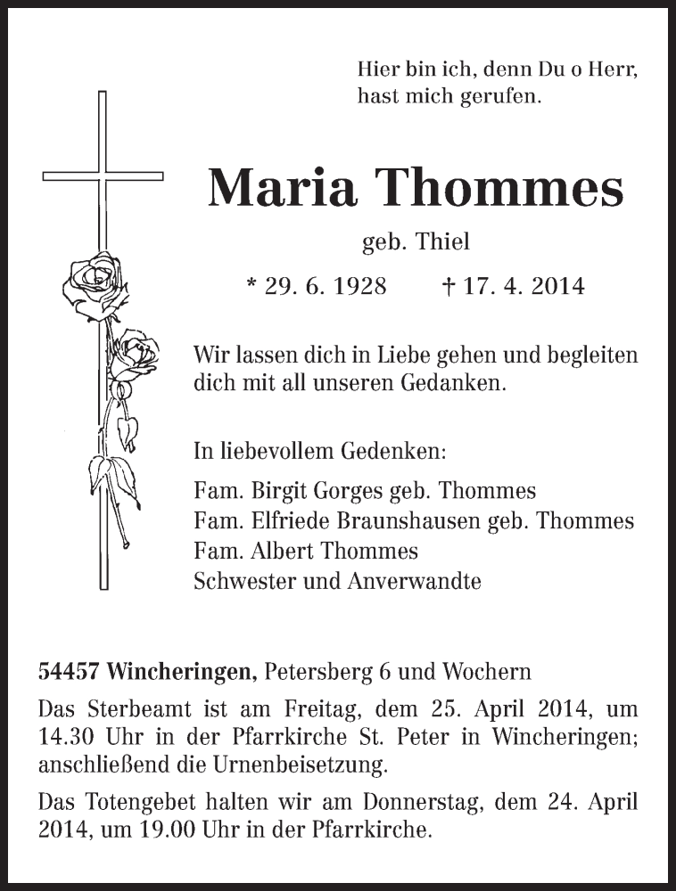 Hier finden Sie alle Traueranzeigen aus der Zeitung, die bisher für Maria Thommes erschienen sind. Weitere Traueranzeigen, die in der Zeitung erscheinen, werden hier ebenfalls aufgelistet