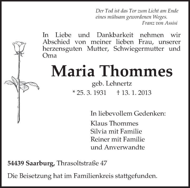 Hier finden Sie alle Traueranzeigen aus der Zeitung, die bisher für Maria Thommes erschienen sind. Weitere Traueranzeigen, die in der Zeitung erscheinen, werden hier ebenfalls aufgelistet
