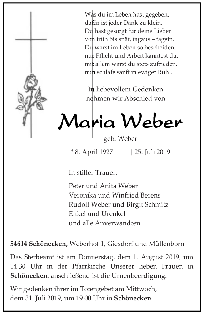 Hier finden Sie alle Traueranzeigen aus der Zeitung, die bisher für Maria Weber erschienen sind. Weitere Traueranzeigen, die in der Zeitung erscheinen, werden hier ebenfalls aufgelistet