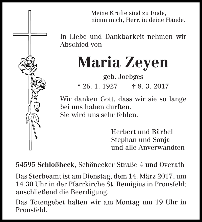 Hier finden Sie alle Traueranzeigen aus der Zeitung, die bisher für Maria Zeyen erschienen sind. Weitere Traueranzeigen, die in der Zeitung erscheinen, werden hier ebenfalls aufgelistet