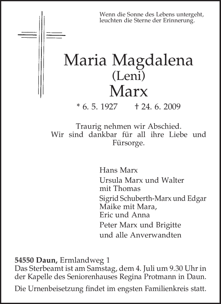 Hier finden Sie alle Traueranzeigen aus der Zeitung, die bisher für Maria Magdalena Marx erschienen sind. Weitere Traueranzeigen, die in der Zeitung erscheinen, werden hier ebenfalls aufgelistet