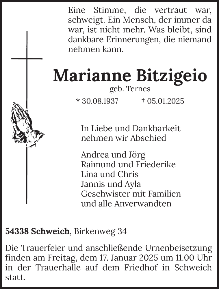 Hier finden Sie alle Traueranzeigen aus der Zeitung, die bisher für Marianne Bitzigeio erschienen sind. Weitere Traueranzeigen, die in der Zeitung erscheinen, werden hier ebenfalls aufgelistet