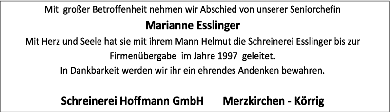 Hier finden Sie alle Traueranzeigen aus der Zeitung, die bisher für Marianne Esslinger erschienen sind. Weitere Traueranzeigen, die in der Zeitung erscheinen, werden hier ebenfalls aufgelistet