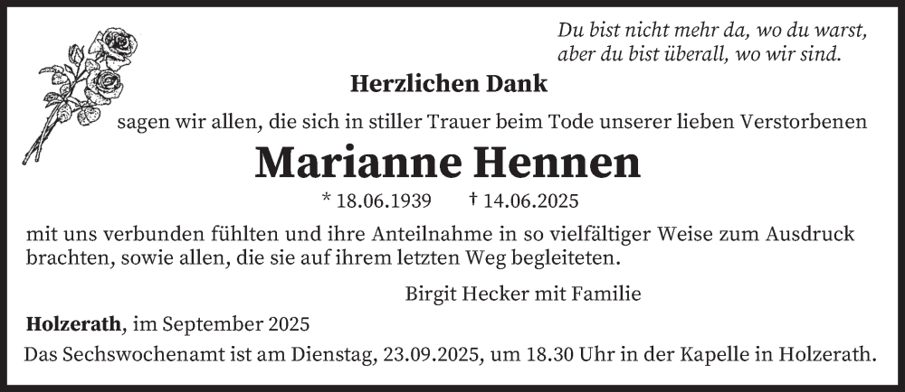 Hier finden Sie alle Traueranzeigen aus der Zeitung, die bisher für Marianne Hennen erschienen sind. Weitere Traueranzeigen, die in der Zeitung erscheinen, werden hier ebenfalls aufgelistet
