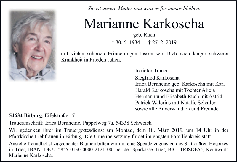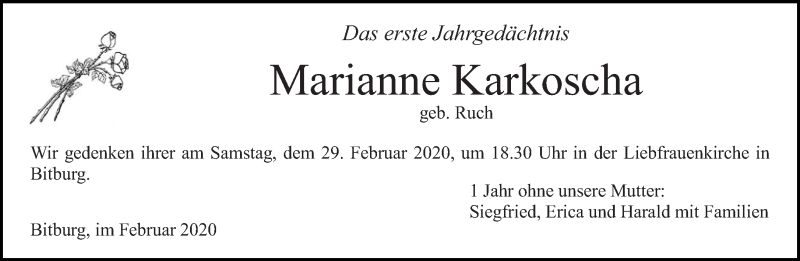 Hier finden Sie alle Traueranzeigen aus der Zeitung, die bisher für Marianne Karkoscha erschienen sind. Weitere Traueranzeigen, die in der Zeitung erscheinen, werden hier ebenfalls aufgelistet