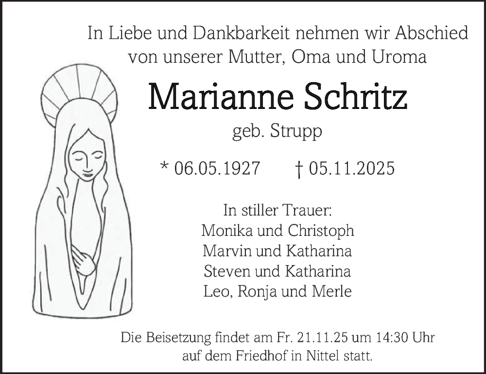 Hier finden Sie alle Traueranzeigen aus der Zeitung, die bisher für Marianne Schritz erschienen sind. Weitere Traueranzeigen, die in der Zeitung erscheinen, werden hier ebenfalls aufgelistet