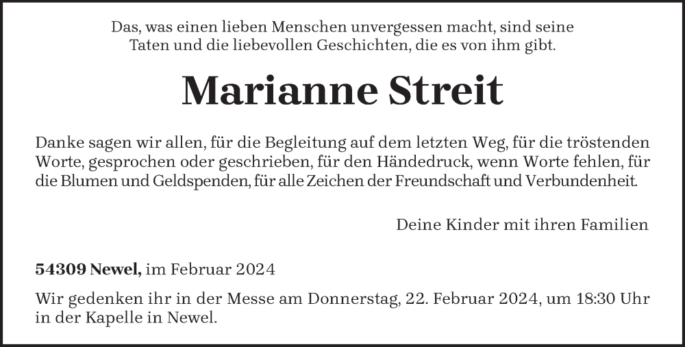 Hier finden Sie alle Traueranzeigen aus der Zeitung, die bisher für Marianne Streit erschienen sind. Weitere Traueranzeigen, die in der Zeitung erscheinen, werden hier ebenfalls aufgelistet