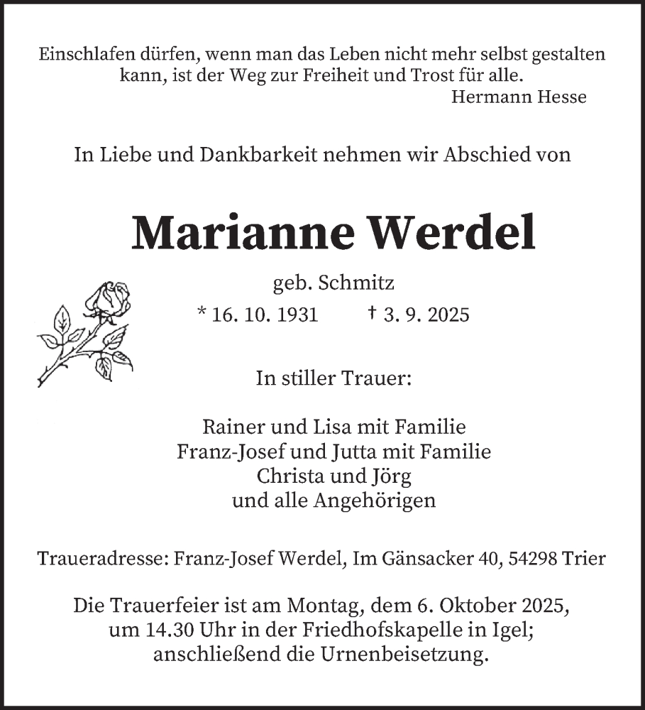 Hier finden Sie alle Traueranzeigen aus der Zeitung, die bisher für Marianne Werdel erschienen sind. Weitere Traueranzeigen, die in der Zeitung erscheinen, werden hier ebenfalls aufgelistet