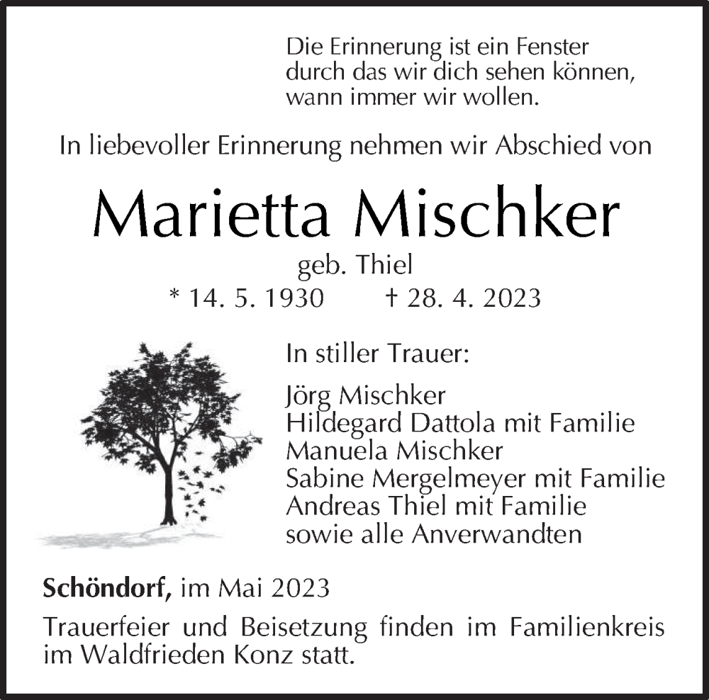Hier finden Sie alle Traueranzeigen aus der Zeitung, die bisher für Marietta Mischker erschienen sind. Weitere Traueranzeigen, die in der Zeitung erscheinen, werden hier ebenfalls aufgelistet
