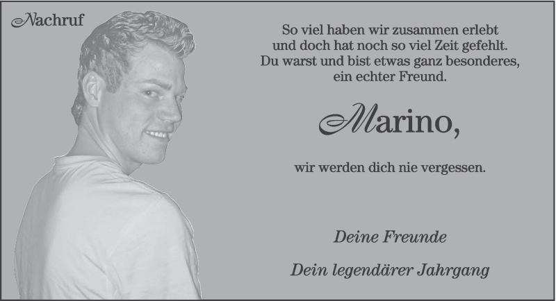 Hier finden Sie alle Traueranzeigen aus der Zeitung, die bisher für Marino Jänen erschienen sind. Weitere Traueranzeigen, die in der Zeitung erscheinen, werden hier ebenfalls aufgelistet