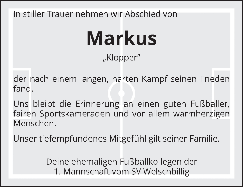 Hier finden Sie alle Traueranzeigen aus der Zeitung, die bisher für Markus erschienen sind. Weitere Traueranzeigen, die in der Zeitung erscheinen, werden hier ebenfalls aufgelistet