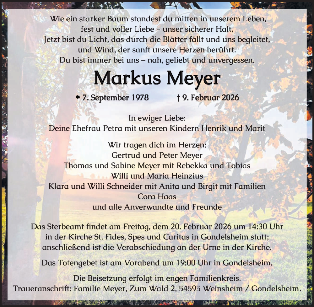 Hier finden Sie alle Traueranzeigen aus der Zeitung, die bisher für Markus Meyer erschienen sind. Weitere Traueranzeigen, die in der Zeitung erscheinen, werden hier ebenfalls aufgelistet