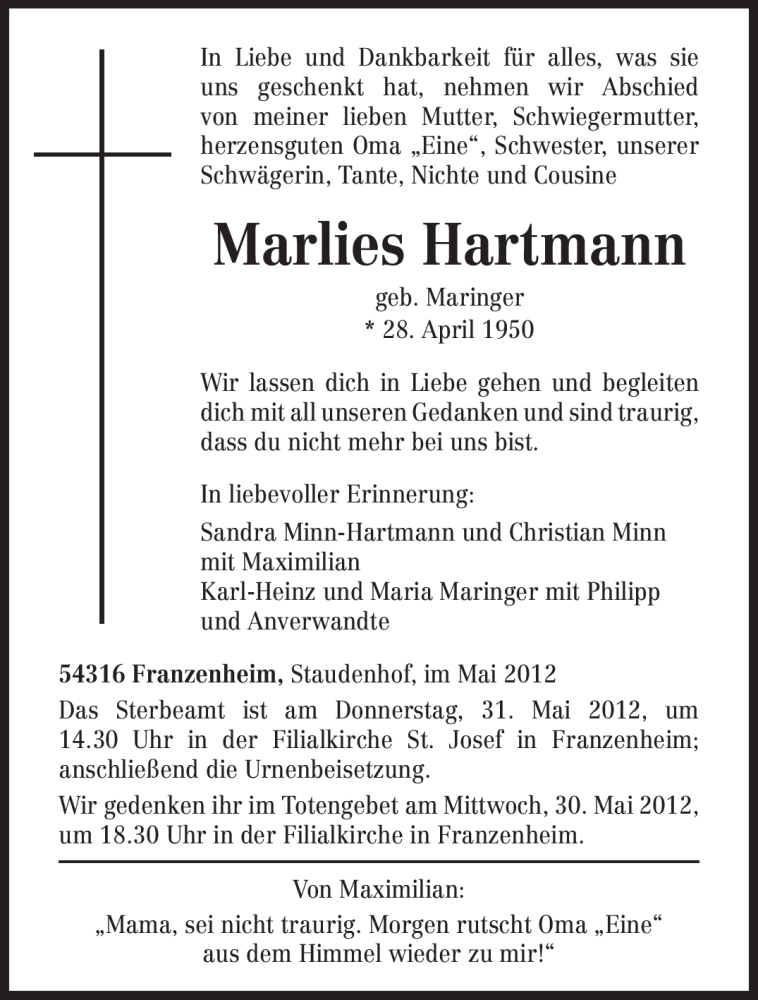 Hier finden Sie alle Traueranzeigen aus der Zeitung, die bisher für Marlies Hartmann erschienen sind. Weitere Traueranzeigen, die in der Zeitung erscheinen, werden hier ebenfalls aufgelistet