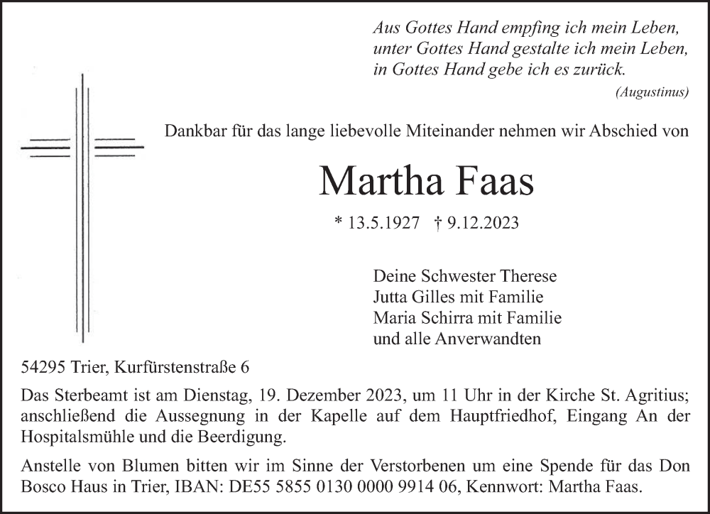 Hier finden Sie alle Traueranzeigen aus der Zeitung, die bisher für Martha Faas erschienen sind. Weitere Traueranzeigen, die in der Zeitung erscheinen, werden hier ebenfalls aufgelistet