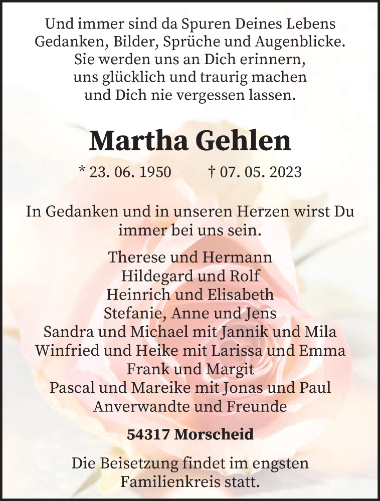 Hier finden Sie alle Traueranzeigen aus der Zeitung, die bisher für Martha Gehlen erschienen sind. Weitere Traueranzeigen, die in der Zeitung erscheinen, werden hier ebenfalls aufgelistet