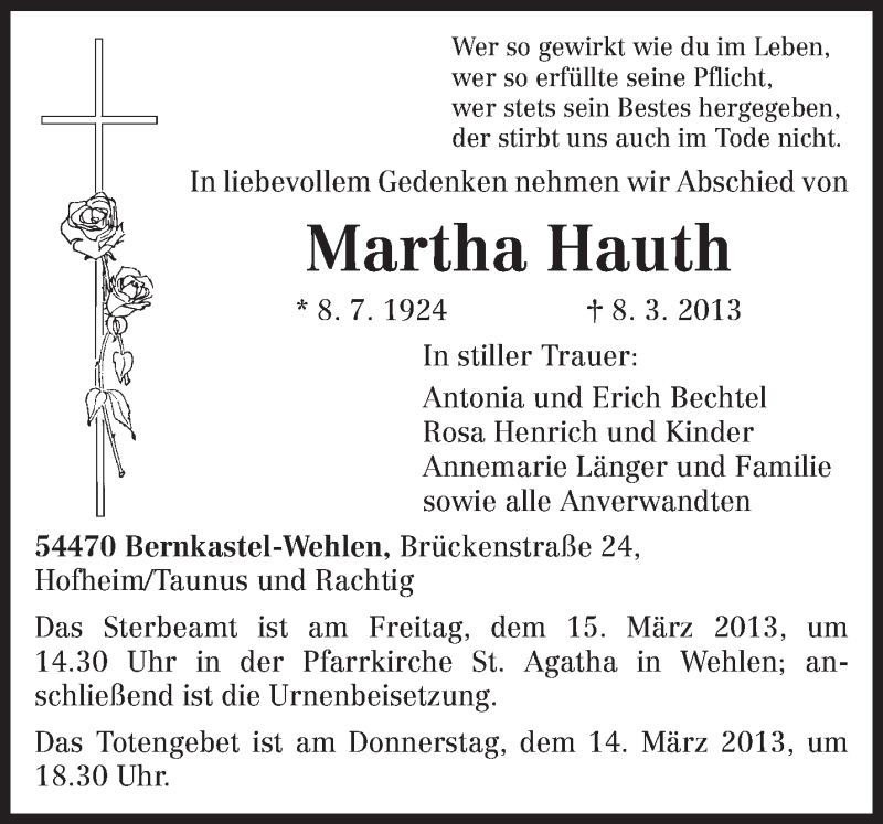Hier finden Sie alle Traueranzeigen aus der Zeitung, die bisher für Martha Hauth erschienen sind. Weitere Traueranzeigen, die in der Zeitung erscheinen, werden hier ebenfalls aufgelistet