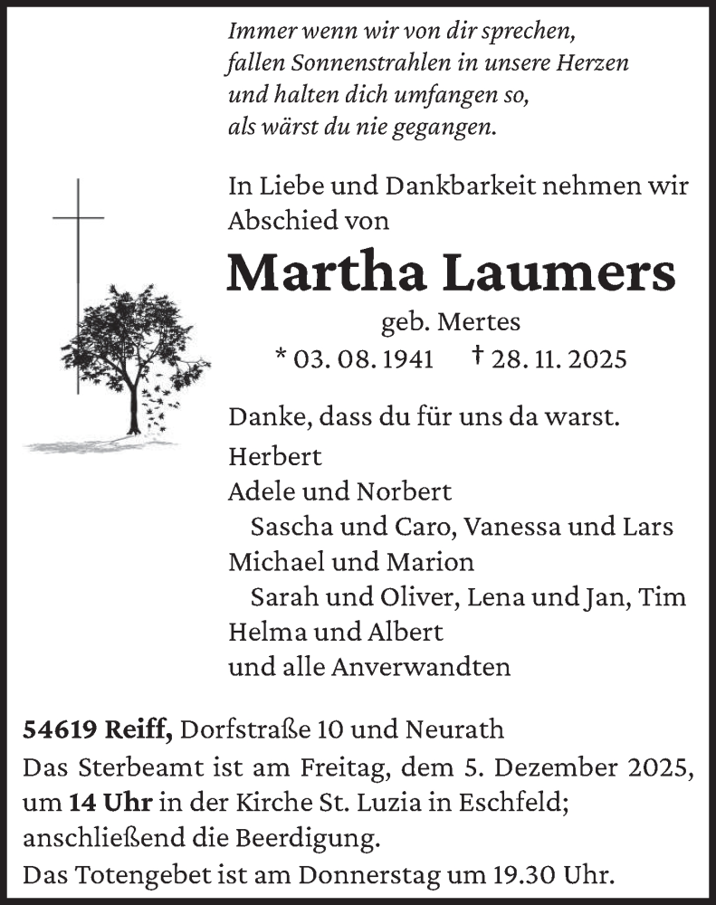 Hier finden Sie alle Traueranzeigen aus der Zeitung, die bisher für Martha Laumers erschienen sind. Weitere Traueranzeigen, die in der Zeitung erscheinen, werden hier ebenfalls aufgelistet
