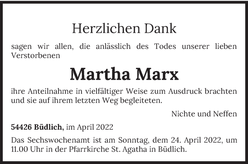 Hier finden Sie alle Traueranzeigen aus der Zeitung, die bisher für Martha Marx erschienen sind. Weitere Traueranzeigen, die in der Zeitung erscheinen, werden hier ebenfalls aufgelistet