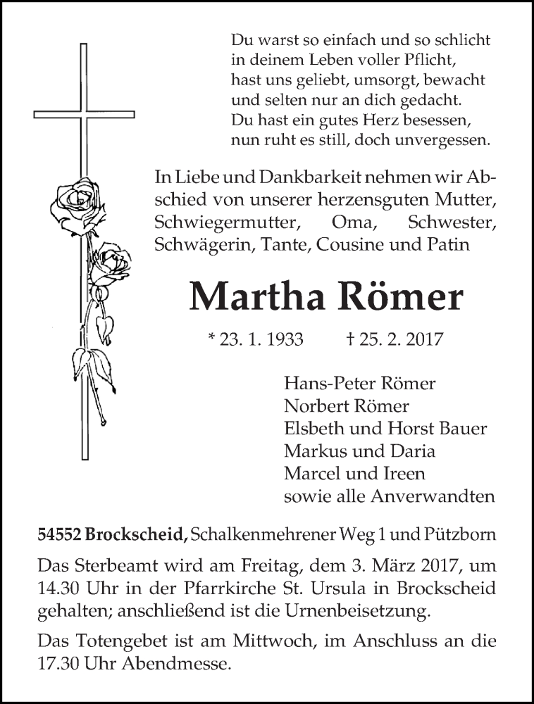 Hier finden Sie alle Traueranzeigen aus der Zeitung, die bisher für Martha Römer erschienen sind. Weitere Traueranzeigen, die in der Zeitung erscheinen, werden hier ebenfalls aufgelistet