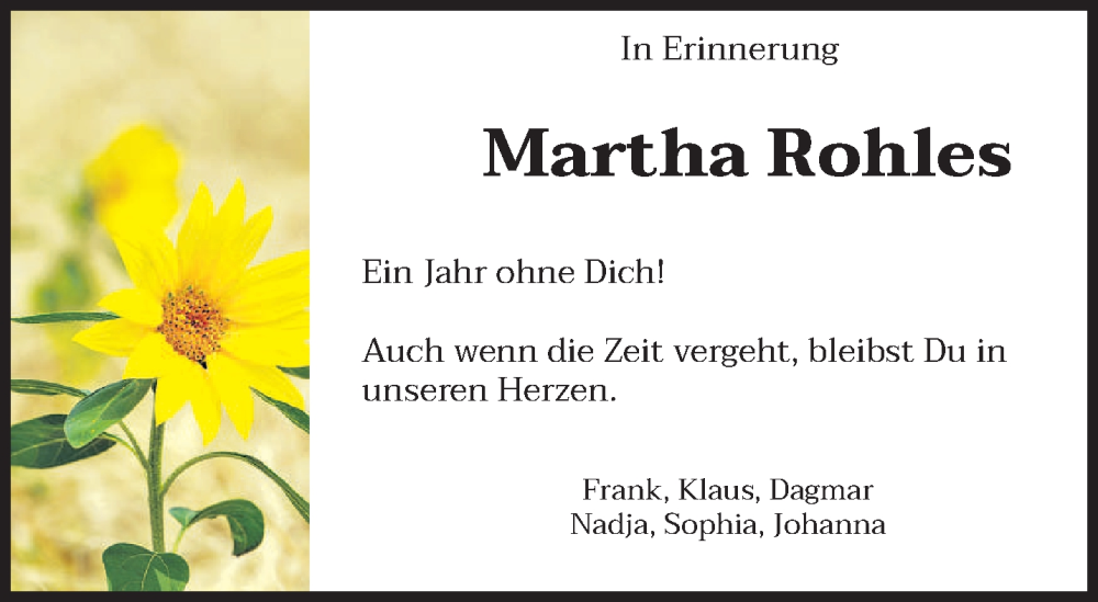 Hier finden Sie alle Traueranzeigen aus der Zeitung, die bisher für Martha Rohles erschienen sind. Weitere Traueranzeigen, die in der Zeitung erscheinen, werden hier ebenfalls aufgelistet
