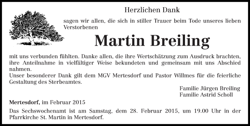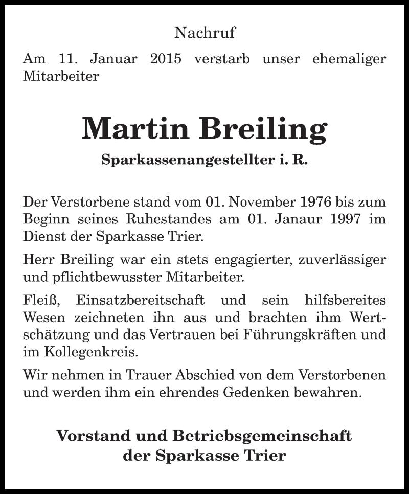 Hier finden Sie alle Traueranzeigen aus der Zeitung, die bisher für Martin Breiling erschienen sind. Weitere Traueranzeigen, die in der Zeitung erscheinen, werden hier ebenfalls aufgelistet