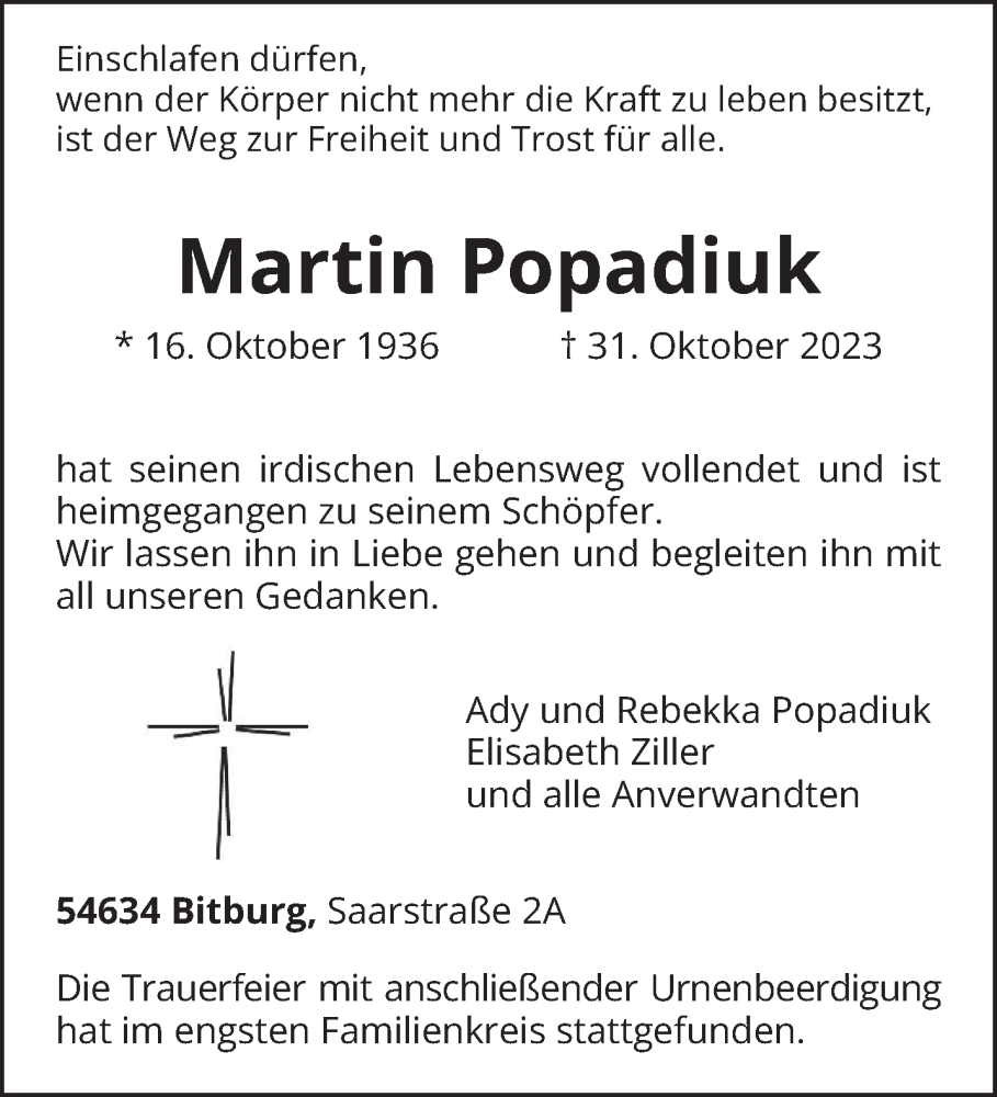 Hier finden Sie alle Traueranzeigen aus der Zeitung, die bisher für Martin Popadiuk erschienen sind. Weitere Traueranzeigen, die in der Zeitung erscheinen, werden hier ebenfalls aufgelistet