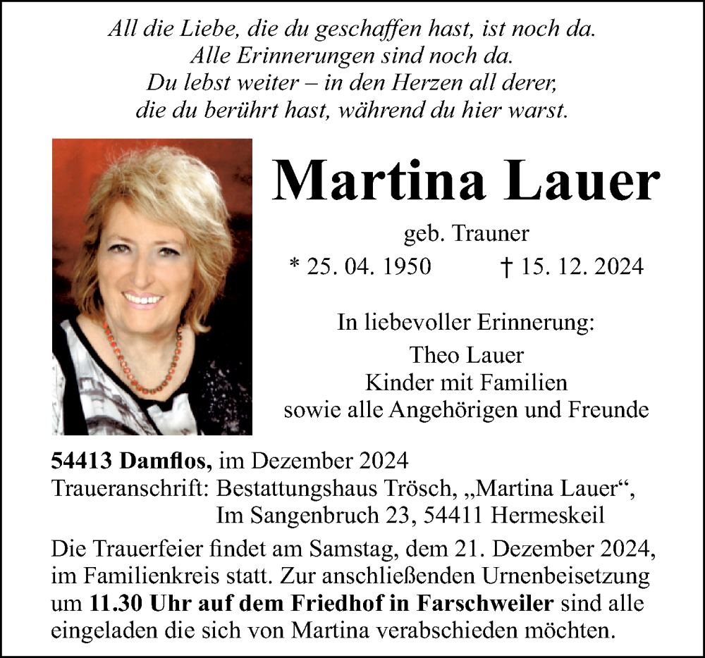 Hier finden Sie alle Traueranzeigen aus der Zeitung, die bisher für Martina Lauer erschienen sind. Weitere Traueranzeigen, die in der Zeitung erscheinen, werden hier ebenfalls aufgelistet