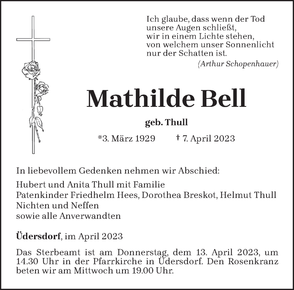 Hier finden Sie alle Traueranzeigen aus der Zeitung, die bisher für Mathilde Bell erschienen sind. Weitere Traueranzeigen, die in der Zeitung erscheinen, werden hier ebenfalls aufgelistet