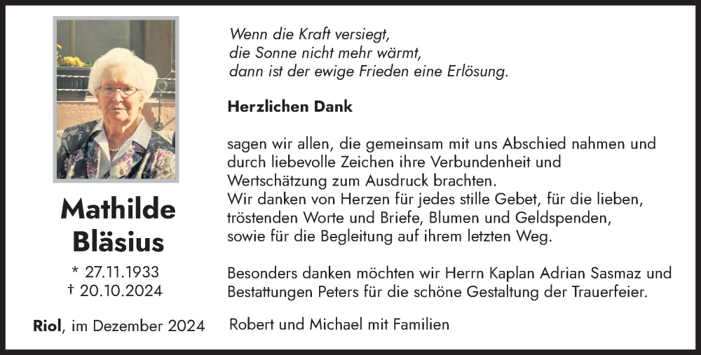 Hier finden Sie alle Traueranzeigen aus der Zeitung, die bisher für Mathilde Bläsius erschienen sind. Weitere Traueranzeigen, die in der Zeitung erscheinen, werden hier ebenfalls aufgelistet
