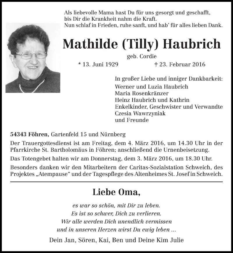 Hier finden Sie alle Traueranzeigen aus der Zeitung, die bisher für Mathilde Haubrich erschienen sind. Weitere Traueranzeigen, die in der Zeitung erscheinen, werden hier ebenfalls aufgelistet