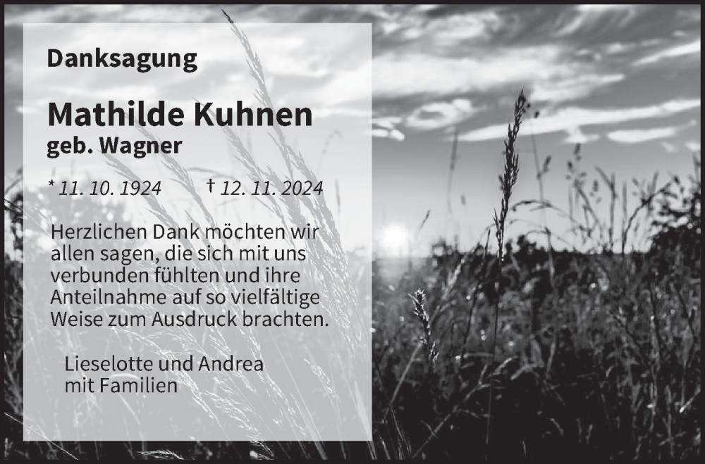 Hier finden Sie alle Traueranzeigen aus der Zeitung, die bisher für Mathilde Kuhnen erschienen sind. Weitere Traueranzeigen, die in der Zeitung erscheinen, werden hier ebenfalls aufgelistet