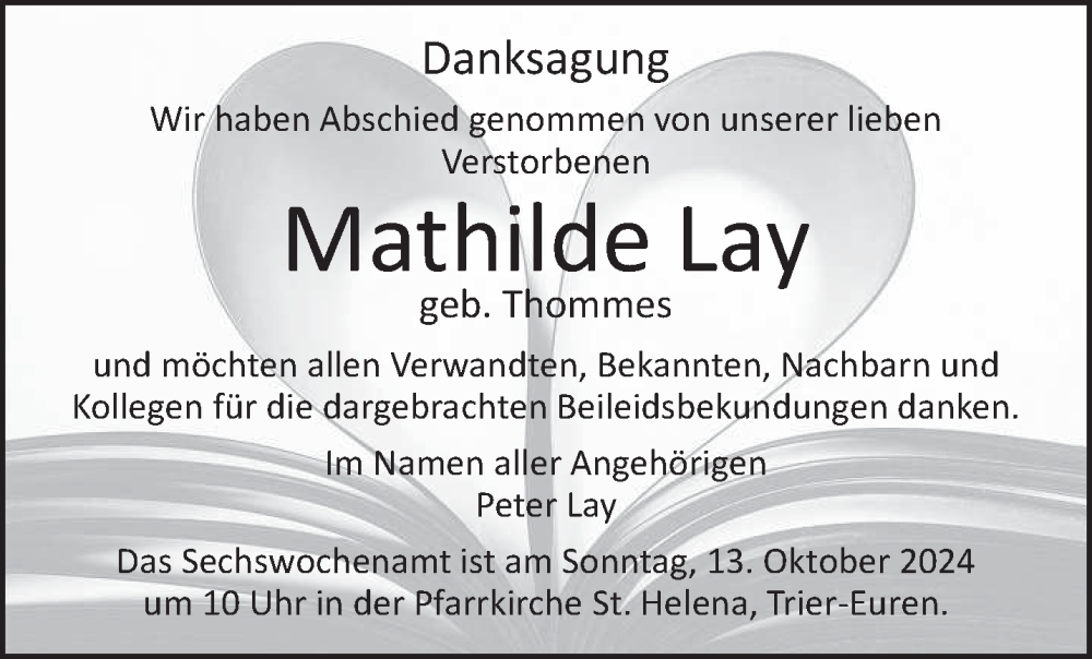Hier finden Sie alle Traueranzeigen aus der Zeitung, die bisher für Mathilde Lay erschienen sind. Weitere Traueranzeigen, die in der Zeitung erscheinen, werden hier ebenfalls aufgelistet