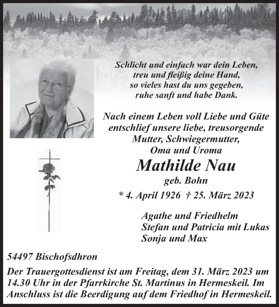 Hier finden Sie alle Traueranzeigen aus der Zeitung, die bisher für Mathilde Nau erschienen sind. Weitere Traueranzeigen, die in der Zeitung erscheinen, werden hier ebenfalls aufgelistet