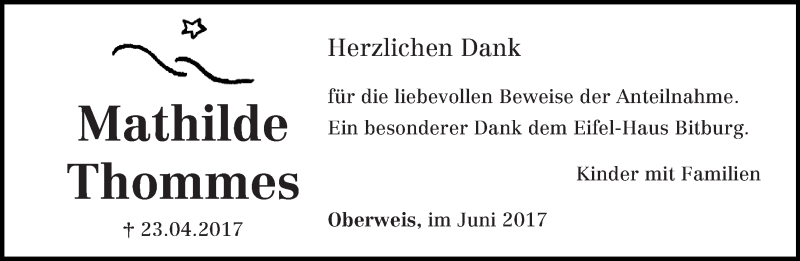 Hier finden Sie alle Traueranzeigen aus der Zeitung, die bisher für Mathilde Thommes erschienen sind. Weitere Traueranzeigen, die in der Zeitung erscheinen, werden hier ebenfalls aufgelistet